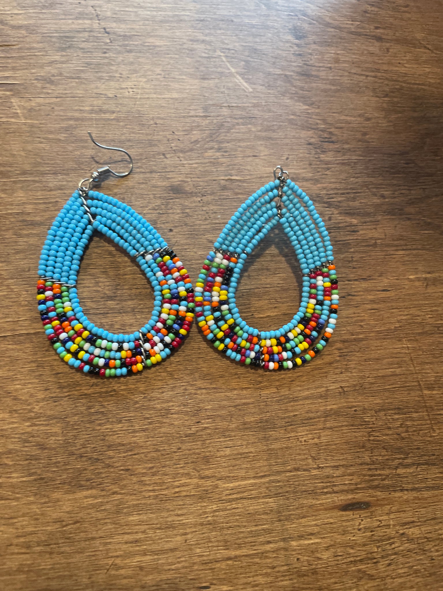 Handmade out of glass beads with woven tops to the strands of seed beads. The diameter is about 5.5 cm.